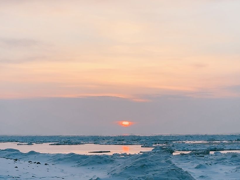 水平線上の雲が厚く、夕陽が見れないかと思いましたが、流氷と雲の向こうに沈む真っ赤な太陽を眺めることができました。