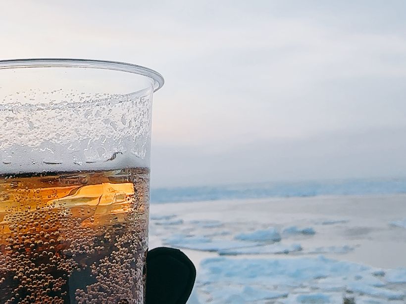 黄昏時、流氷が覆う海岸沿いで知床のガラナを飲みながらの素敵な時間。ホテル送迎もあるし、夕方からのアクティビティなので、知床に来た初日に参加可能なのも嬉しいところです。