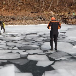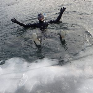 2020幎2æäžæ¬ã«åå ããŸãããéåå Žæã«ã€ããšãã©ã€ã¹ãŒãã®çæ¹ãäžå¯§ã«æããŠãããããŸãçãã®ãæäŒã£ãŠããããã®ã§å®å¿ã§ãããè»ã§5åãããã®æ¯ç¬æ¹ã®å°ããªå ¥ãæ±ã®ã»ãšãã«è¡ããšããã¹ã³ãŒãïŒååãããã®ãšãªã¢ãåã£ãŠãŸãããé ãããèŠããšçœãæ°·ãšéæãªæ°·ããŸã ãã«èŠããŸãããããã¯æ¹ã®æ°Žããã®ãŸãŸåããšéæã«ãªããéãç©ãã£ãéªãåããšçœããªãããã§ããæåéæãªæ°·ã¯åã¿ããªããŠæº¶ãããã£ãŠãã®ããªããšæããŸããããããªäºã¯ãªãããªãååã衚局ã§ãããã¬ã€ãããããã«ãã·ãæã£ãŠããŠããŠè²žããŠãããå²ãããšããŸãããå šç¶å²ããŸããã§ãããå²ããŠããæ°·ãæã«åããšèŠãããšã®ãªã圢ã§çµæ¶åããŠããŠçããã£ãã§ããæ°·ã®ç«¯ããæ¹ã«å ¥ãããšãåºæ¥ãŸããããã®ææã«ããŠã¯ãšãŠãæãã倿°æž©5âãæ°Žæž©2âãšã®äºã§æ°ŽãçŽæ¥è§Šããé¡ä»¥å€ã¯å¯ãå·ããã¯ã»ãŒæããŸããã§ãããã¡ãªã¿ã«ãã©ã€ã¹ãŒãã®äžã¯Tã·ã£ããšäžäžã¹ãŠã§ãããç蟌ã¿ãè¶³å ã«ã¯è²Œãã«ã€ããçããŠããŸããŸããäœéšåŸãã£ããæ±ã°ãã§ããçšã§ããããã©ã€ã¹ãŒãã®äžã®ç©ºæ°ããããŠæããã«å ¥ãã®ã§æ°Žã«ãã«ãã«æµ®ãã®ã§æ³³ããªããŠãå®å¿ã§ãããå·ãããæããã«ãã«ãã«æµ®ããŠé空ãçºããŠãããšãšãŠãæ°æã¡ããã£ãã®ã§ããšïŒæéãããããããŠãããã£ãã§ããã¬ã€ãããããã·ã¥ããŒã±ã«ãåãããã®ã§ãé¡ããã¡ããã¡ãå·ããã§ãããæ°·ã®è£åŽãèŠããæ¹ã®åºããã£ãã芳å¯ããããšãåºæ¥ãŸããæ°·ã®äžã«ç«ã£ããæ¹ã«å ¥ã£ãŠãæéã¯40-50åçšã§æ®ãæéã§ãã©ã€ã¹ãŒãçããè±ãã ãã®æºåãšç§»åã粟ç®ãªã©ã§å šéšã§1æéãšã¡ãã£ãšã®æèŠæéã§ãããå¯ããªãã£ãã®ã§ãããåãããã®æéãã£ãŠãè¯ããããçãæããŸããããªããªãåºæ¥ãªãçããäœéšãã§ããŠãšãŠãæºè¶³ã§ãã