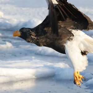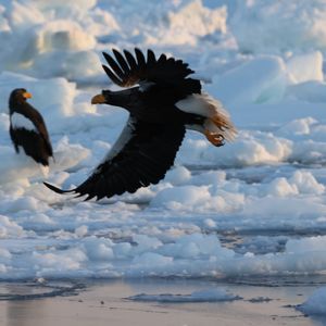 この日は、羅臼港周辺には流氷の姿はなかったのですが、船は、知床半島の北端の方まで足を伸ばしてくれました。そこには、流氷群とその上には、沢山のワシたちが。天気も良く、素晴らしい日の出と、ワシたちを撮影することができました。また、船長も写真撮影のことを意識して、流氷と日の出の太陽の位置を考えて船を動かしてくれました。おかげで初心者の私でも、素晴らしい写真が撮れました。