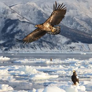 一面流氷に覆われた冬のオホーツク海を、流氷クルーズに乗って豪快に流氷を砕きながら、進んだ先に広がる幻想的な景色を見に行きませんか? 船上では、足元に伝わってくる振動とデッキから見える青空、そして白い流氷の展望は迫力満点です! また、氷の上にたたずむオオワシや愛くるしい姿のアザラシなどの動物を是非カメラに収めてみてください。