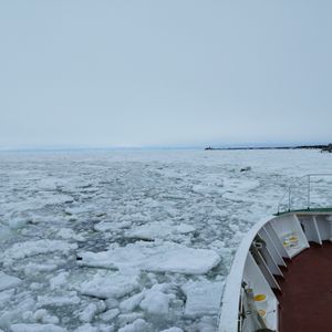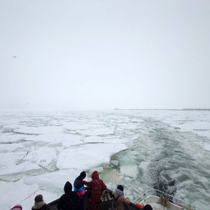 晴天の中の流氷を期待しましたが、生憎の曇り空で雪が舞う中となってしまいましたが、時折船内に響く流氷との衝突音とエンジンが唸る音は圧巻でした。