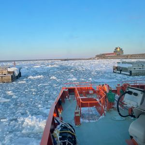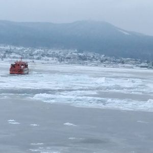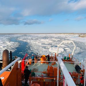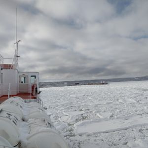 ほぼ快晴の中風もなく氷点下の気温でも寒さを感じませんでした。流氷は岸近くまで迫っており見渡す限り真っ白な海面を見ることができました。砕氷船ではないので流氷を避けて進みますが船体に当たると音と共に揺れます。スタッフの解説も興味がわきました。