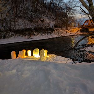 帰り道の氷瀑まつりは旭川に近い場所のようで、日が落ちてからの寒さを体感できました。ガリンコ号の船外よりよほど寒い。良い経験になりました。