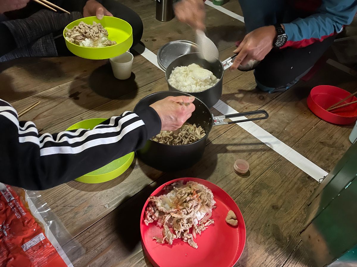 避難小屋での夕食は1泊2日ツアーの醍醐味ですね。みんなで囲む食事は本当に美味しいですね。