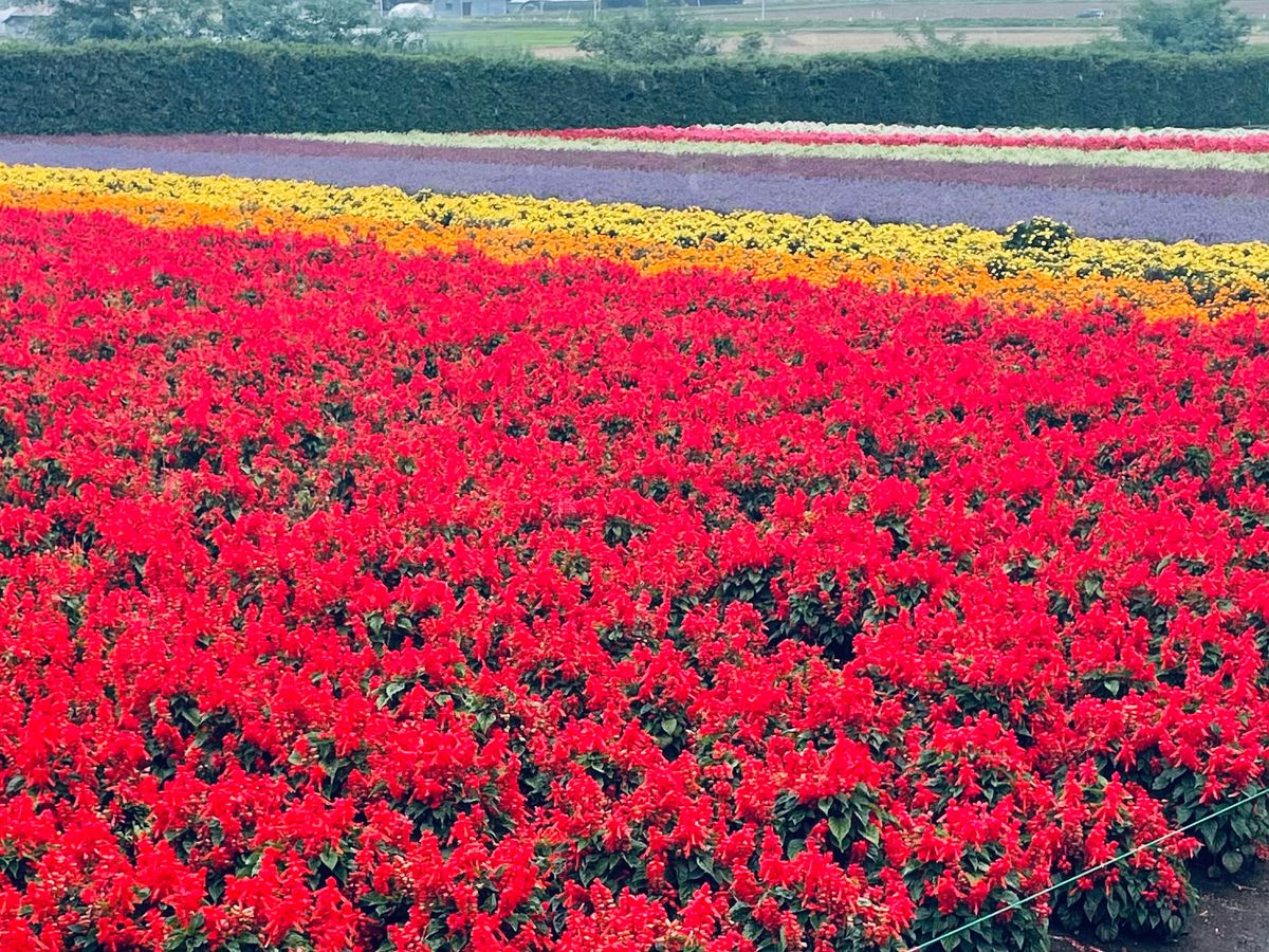 ファーム富田の所では少し晴れ間も除いて花畑が綺麗でした。ラベンダーみたいな紫の花もあり色とりどりで良かったです。その後は小雨や曇り空で青い池では曇り空でしたが青色も綺麗で良かったです。ガイドさんも楽しい方で全体的に楽しめました。