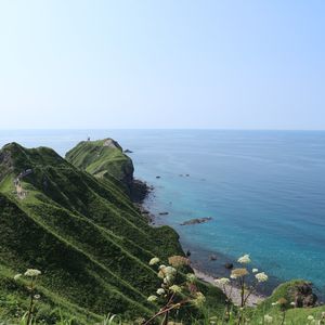 あいにく朝から曇り空、積丹半島に入ったあたりから雨が降りだし、日射しがあたりキラキラ光る積丹ブルーは、見ることが出来なかったけれど、積丹ブルーは、日射しに関わらずブルーなんだと、添乗員さんが教えてくださいました。