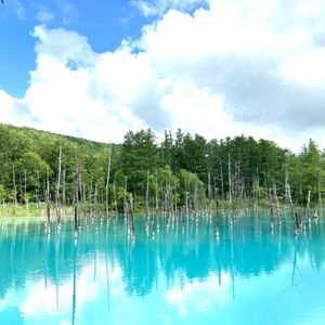 小雨で過ごしました。一番心配だった青の池は雲でも、とてもキレイなブルーで感動!