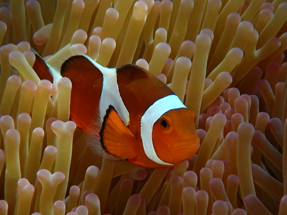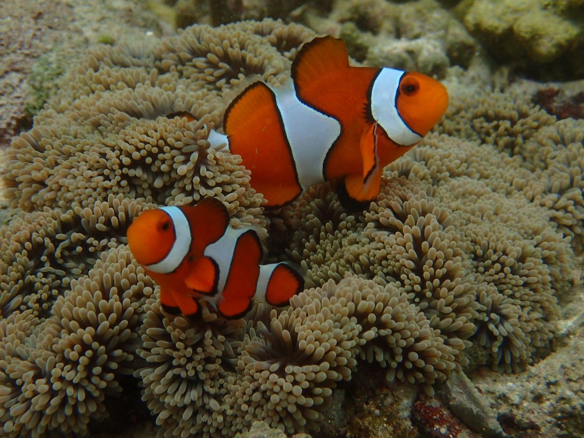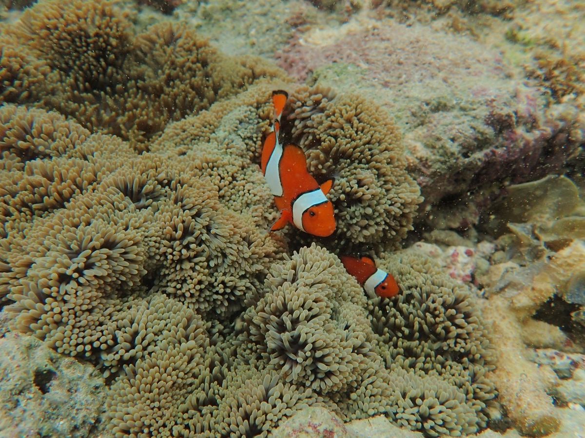 午後なので潮が引いていて海水が少なくなって岩場の水たまりに残されたルリススメダイが沢山泳いでいるのでびっくり!浅瀬のイソギンチャクの中を住み処にしていたカクレクマノミも見つけてくれて感激。