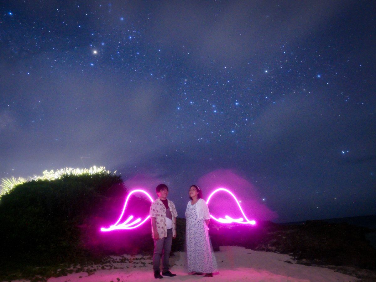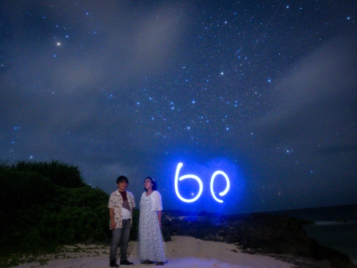 夫婦揃って還暦祝い以前より星空フォトが撮りたくて今回宮古島で念願叶いました若者が多い中若干恥ずかしく思っていましたが思い切って予約❣️当日ムスヌン浜に集合還暦の事を伝えるとペンライトで60とさりげなく入れてくださったり途中雨が降ってきたら待機してすぐ晴れますよと説明してくださりほんと安心して写真を撮ることができましたなんと言っても天使の羽根❣️感動ものです❣️若者はもちろん私たちのような年齢層でもステキな星空フォトを撮って下さいました❣️是非おススメです宮古島の青い空透き通るコバルトブルーの海そして満点の星空❣️おススメです❣️お兄さんありがとうございました素晴らしい思い出ができました❣️
