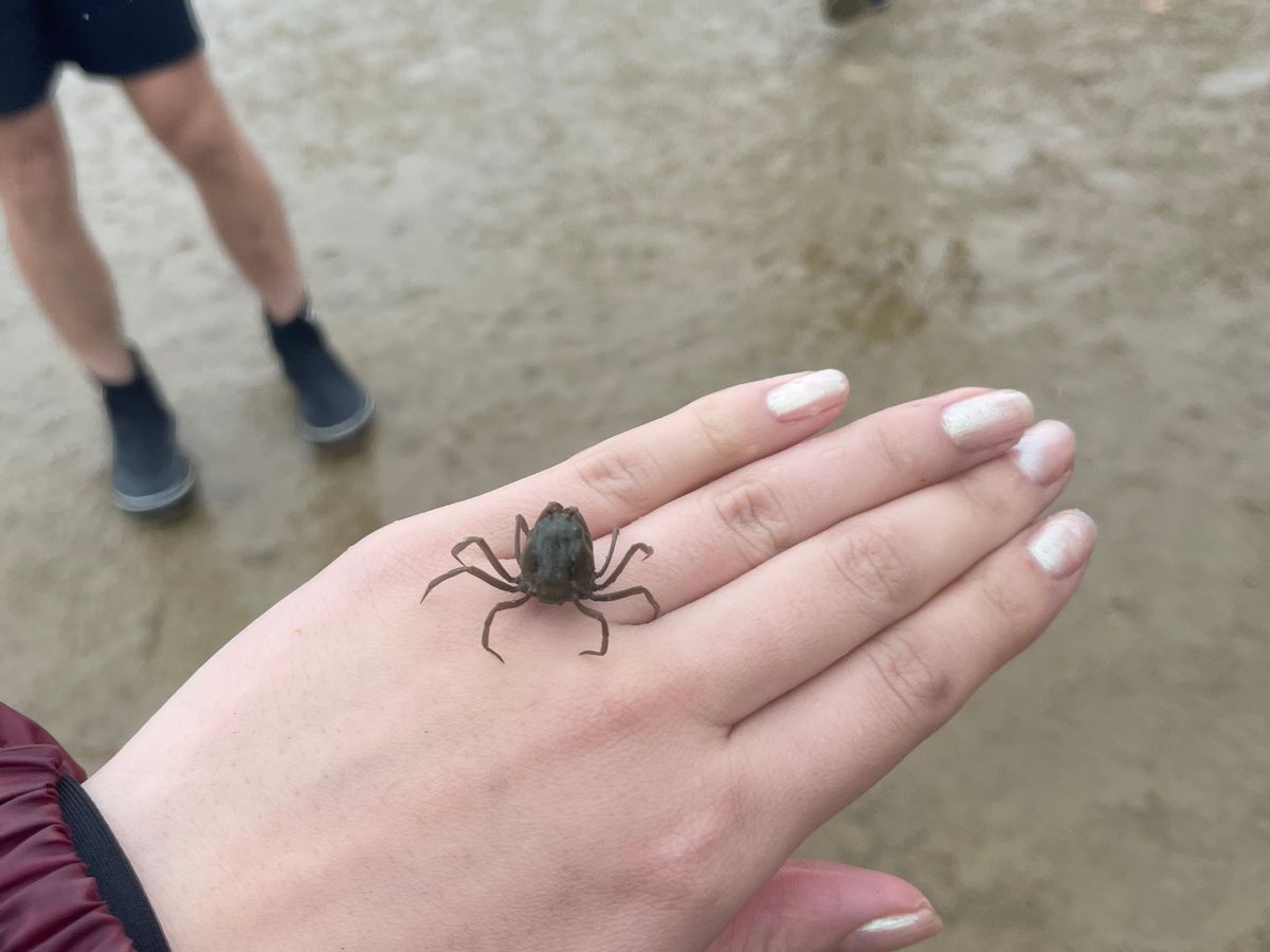 帰りのカヤックでは、干潮で干潟になったところに寄り、コメツキガニなどの動物を捕まえたりして遊びました。