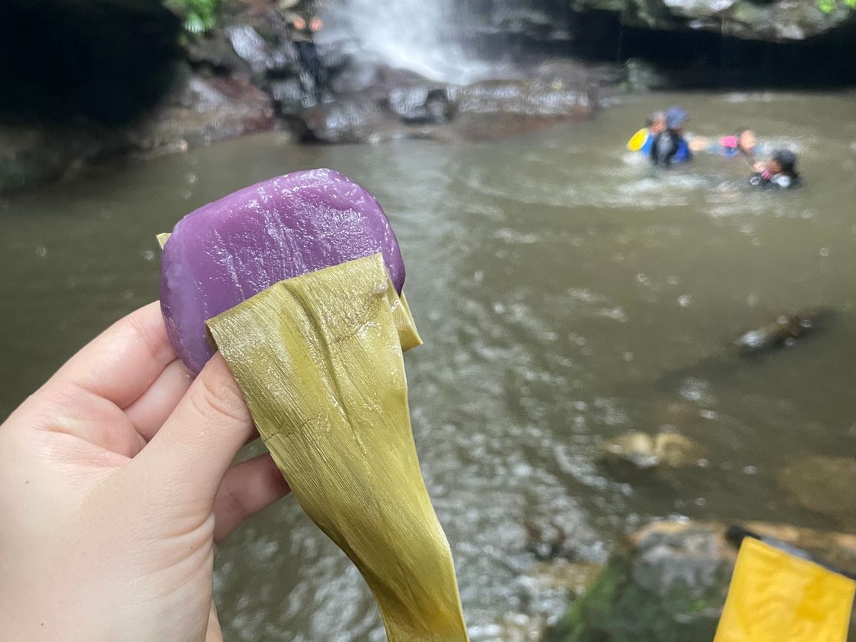 その後またトレッキングをしてクーラの滝に行き、ガイドさん手作りの月桃餅をいただきました。これもまた美味しく、少し疲れた身体に沁みました。