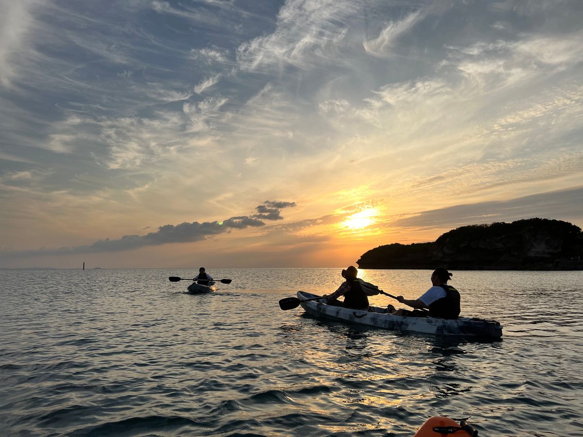 せっかくのサンセットカヤックの予定日が雨予報…。いちかばちかの私のワガママで、当日に変更のお願いに聞いて頂き、その日も曇り時々雨でしたが、夕方は、パァーっと晴れてくれて、キレイな夕日をバックに写真が取れ、少し寒かったけど、楽しかったです。