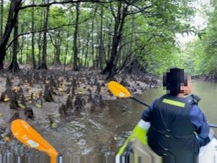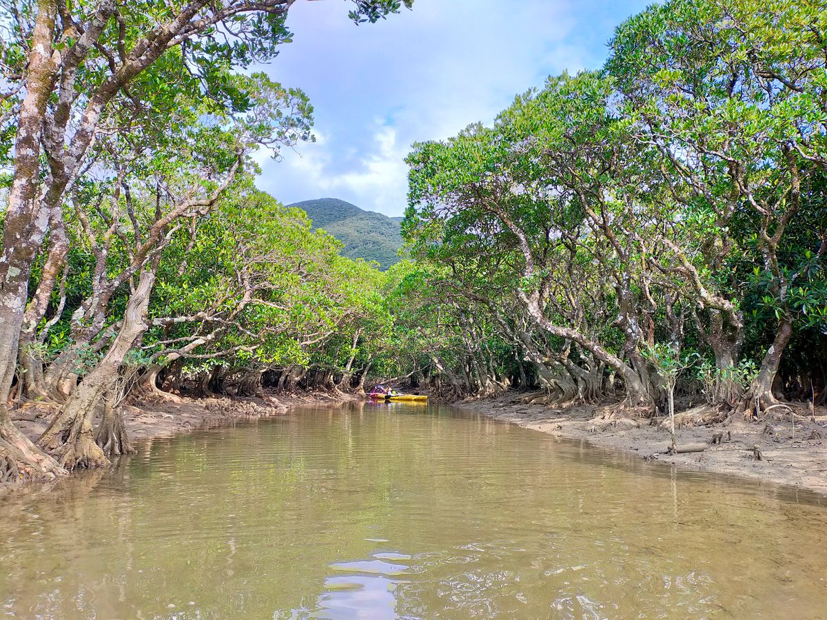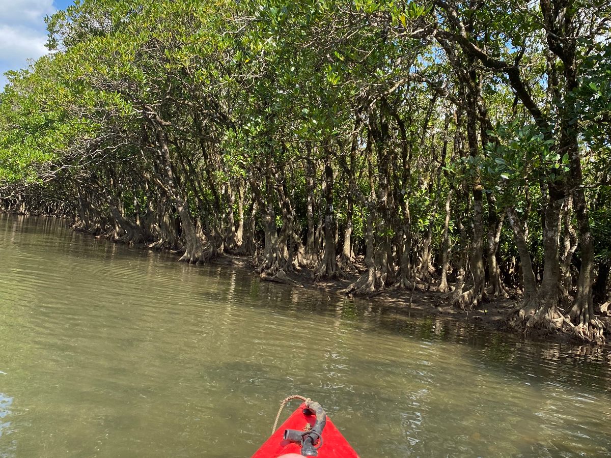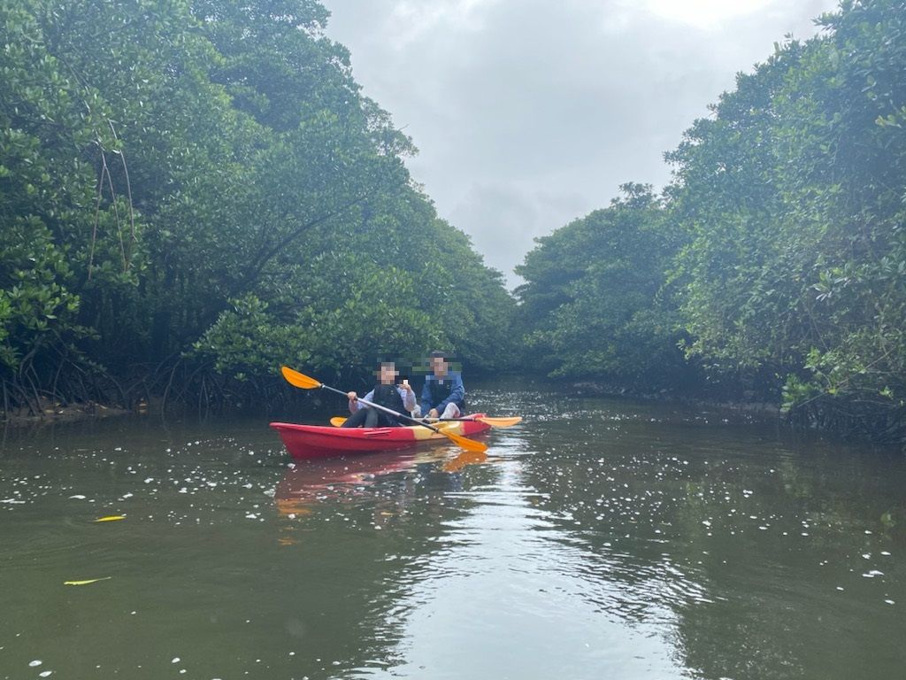 午前中のマングローブクルーズには一度経験のあるカヤックを利用しました。お尻から下が濡れるので速乾性がある化成繊維がおすすめかと思います。