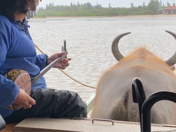 クルーズを終えると、バスに乗車し、水牛の出発地点まで行きました。バス移動の途中、運転手さんが一生懸命に運転しながら現地ガイドをしてくれました。その素朴さも、離島に来た感じがして良かったです。水牛車の出発地点では、7、8頭の水牛が待機しており、グループに分かれて乗り込みました。由布島までの移動中、現地の方が八重山の民謡を歌ってくれて、のんびり水牛に揺られて、ゆったりとした気分になれました。