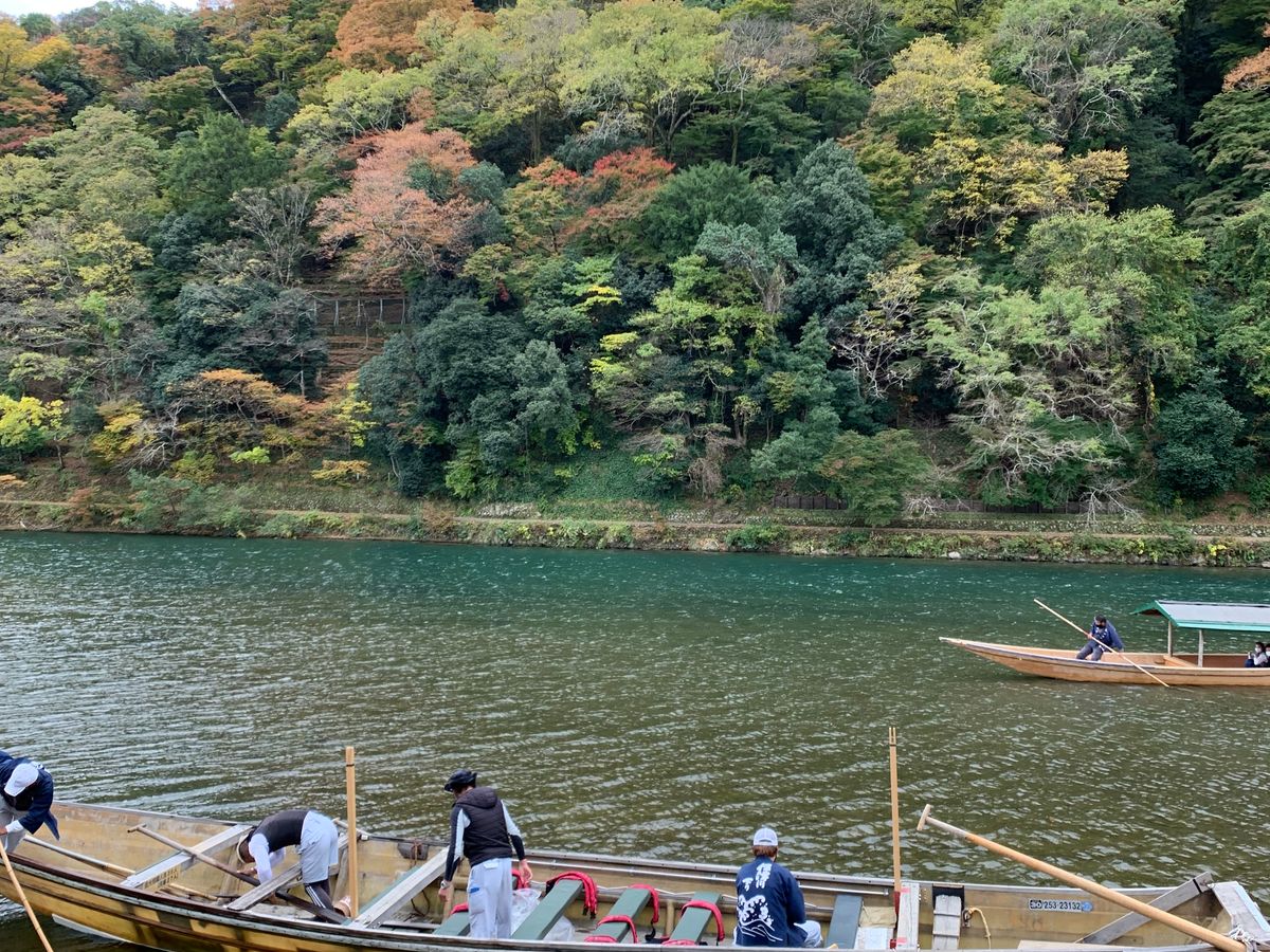 心地よい風と水しぶきにたわむれた保津川下りとなりました。川の水が少なく約2時間と長めの乗船でしたが船が揺れると「わ~」という声がもれました。船頭さんに「キャー」でお願いします、といわれましたが最後まで「わー」のままでした。水嵩が増えた時に参加すればきっと「キャー」になるのかな?紅葉の見ごろは11月中旬になるのではとのことでした。