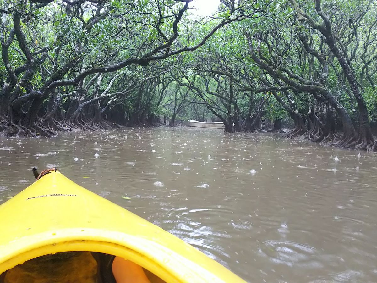 梅雨明け直前で雨の中でのカヌー体験となりました。わずか1~2分のレクチャーを受けただけで何の問題もなく、マングローブの森に漕ぎ進むことができました。増水で干潟も無く、生物には遭遇出来ませんでした。