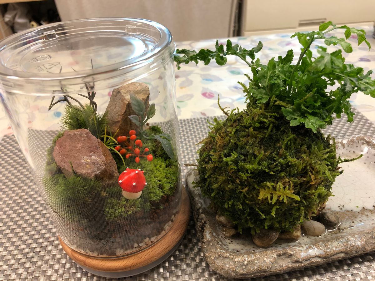参加したのが自分一人だったので懇切丁寧に教えていただいた。今まで未知の領域だった苔の世界。もっと知りたいと思う体験だった。テラリウムと苔玉という趣きの異なる二作品を作れるのもいい。