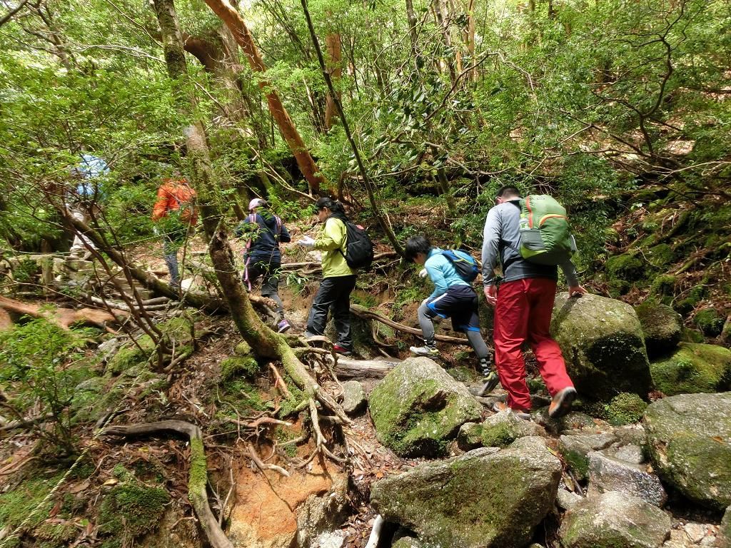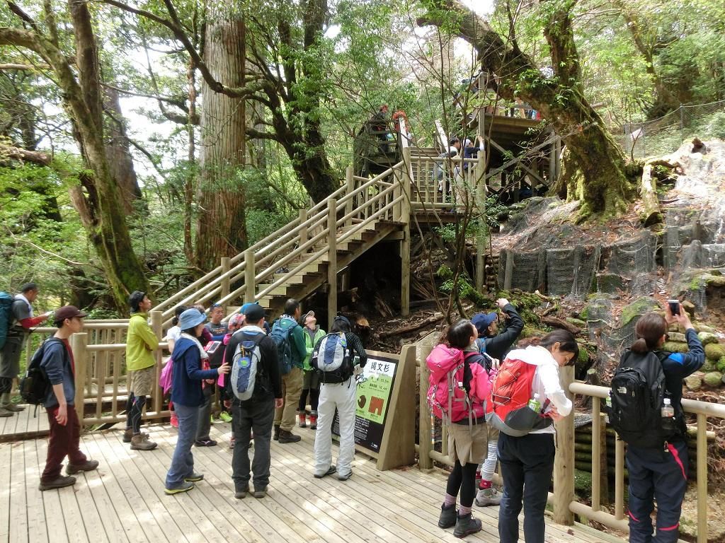 かねてより希望していた縄文杉登山に初挑戦しました。GWの真っ最中でしたが、思っていたほどの人出ではなく(登山道が渋滞するほどと聞いていたので)、ふだんよりも多い程度の登山客だったそうです。4時15分に宿を出発し、途中、シャトルバスに乗り換えて登山口に到着したのが5時40分。軽く準備運動してから5時50分にスタートしました。