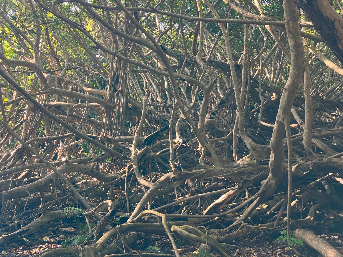 森に到着するまでの道中でも、島や土地の歴史・文化を解説してくださいました。森の入り口ある、認定ガイドと一緒でなければ入れないゲートを開けて、入山。鍵付きゲート、カメラ、利用ルールなどが書かれた看板が設置されており、ちょっとだけピリピリした緊張感のある森の雰囲気を感じました。