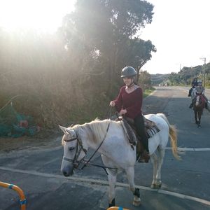 30分ほど馬の乗り方、手綱の握り方、歩く、止まる、曲がる、小走りなど基本的なレッスンを受け、道路を通ってビーチへ向かいました。