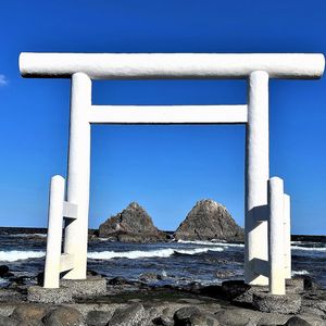 砂浜にある鳥居としめ縄で結ばれ夫婦のように並んでいる