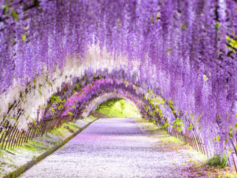 初の藤の花。今年は開花が少し遅れているらしく、7分咲きとの事でした。河内藤は約3,000坪の広大な敷地に、樹齢150年になるいくつもの木がドームや藤棚を作りだして、長さが80m、110mのトンネルは、22種類の藤の花が咲き薄紫や白、ピンクなどカラフルな花で彩られたグラデーションで見る人々を魅了します。園内に漂う香りにも癒やされ、全身で藤を楽しむことができます。