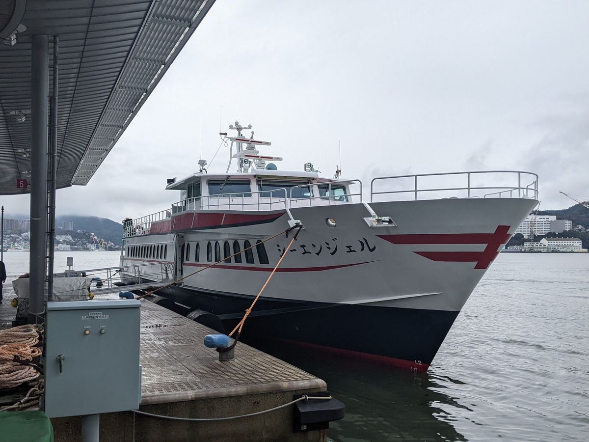 長崎港発の利用は初めてでした。ターミナル内では、旅行会社発行のチケットは必ず窓口で引き換えが必要ですと案内放送もありました。乗船前には検温も実施されていらっしゃいます。船内はとても清潔で、海も穏やかで快適な1時間ちょっとの船旅でした。