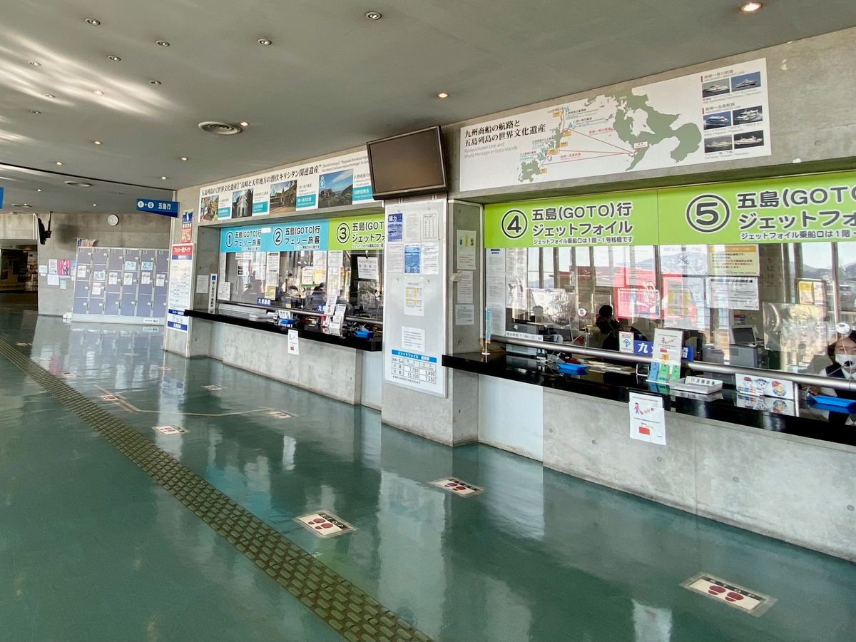 ターミナル内のチケット売り場で、バウチャーのスクショを見せるとすぐ乗船券に引換えてもらえ、簡単チェックインでした。高速船と迷ってフェリーにしましたが、船酔いもせず寝てたらあっという間に福江島に着きました。時化のときは高速船よりフェリーの方が欠航になりにくいとのことで、復路もフェリーにしました。下船時に乗船券は回収されますので、捨てずに保管してください。