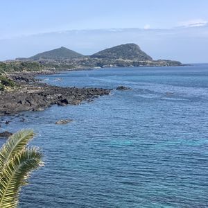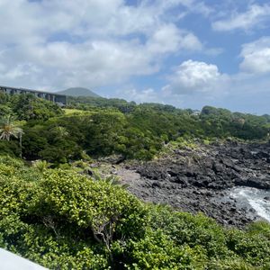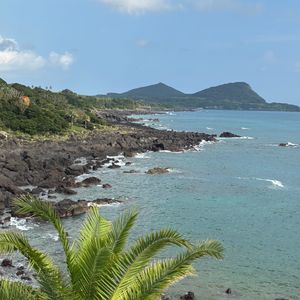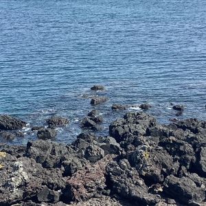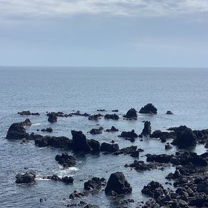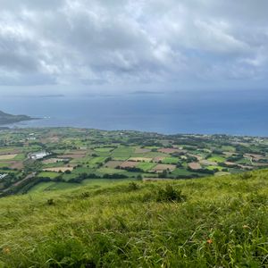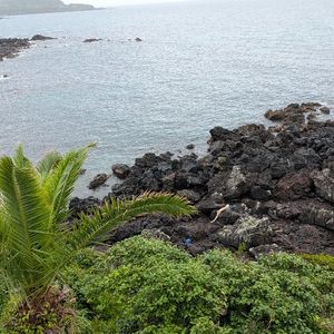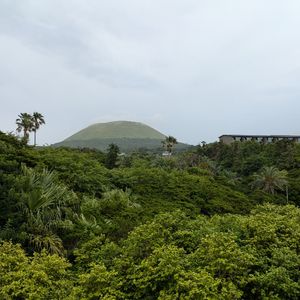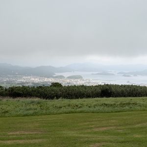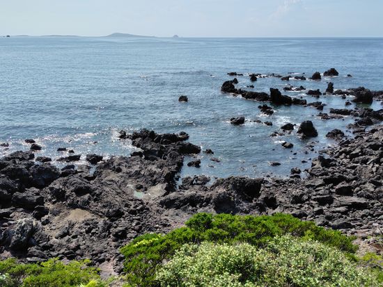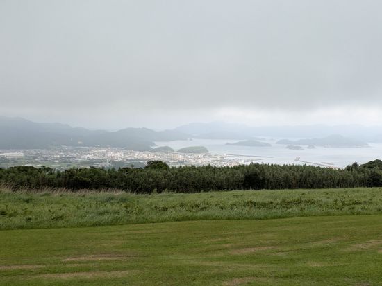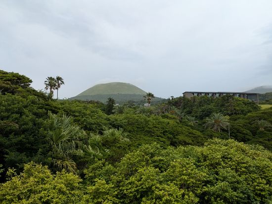 梅雨時で朝から曇り空ではありましたが、幸い鬼岳の展望台からは海や周囲の山々を一望でき、360度の景色を堪能することができました。火口跡を目指してさらに登り始めたあたりで雨がサーッと降ってきて、風も強かったので引き返すことになりましたが、さっき遠くに見えた黒い雲があっという間にこちらに来たな~と実感することが出来て、それはそれで楽しめました。遠くから眺めるだけでも緑が綺麗な鬼岳ですが、くみさんのガイドを聞きつつ実際に歩いてみると、その後に見る溶岩海岸や町なかの古い石垣の見え方も違ってきます。