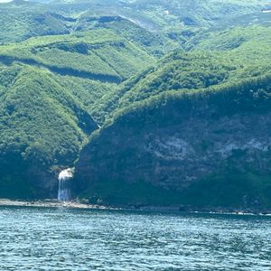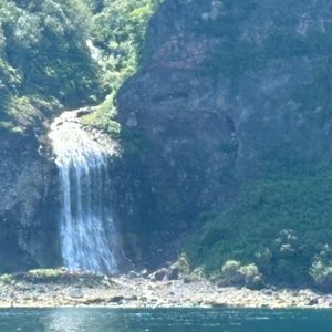私達は8:30の予約で、乗船するのが遅くなったのですが、駐車場に大型観光バスが数台止まっており、船の3階は人が多く、人が入るスペースがないくらいに多かったです。2階は左右とも椅子が埋まってました、特別室はアジア系の観光客が大勢いてやめました。1階は往路の岸側である右側が埋まってました。ちなみに下船したときは、次の乗船待ちの方が長蛇の列で、観光バスもだいぶ増えてました。船は岸から離れる時間が多く、壮大な景色を見るにはいいかもしれませ。航路は往復で岸からの距離、時間とも一緒だと思いました。岸近くを走る小型船の写真を載せましたが、岸からの距離の違いはかなりあると思います。理想は、往路はもっと岸よりを進み、復路は今回のような距離で離れて進み、乗客は船の半分が埋まる程度の人ならいいなと思いました。復路は飽きてしまった人が大勢見受けられました。