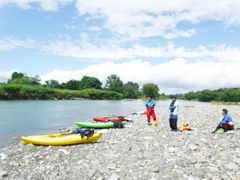出発前には操作方法をしっかり練習。カヤックにランチを積んだら、ロングツアーへ出発です。早瀬を進んだり、大空をあおいだり。お昼には川原でのんびりランチタイム♪雄大な景色の中で自然と一体となって遊ぶ極上の1日になること間違いなし!