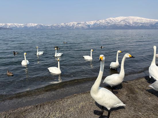 なんと湖畔の砂場の下からは、温泉が沸き出ています。(手やスコップで砂を掘ると、お湯が出てくる場所も!)そのため冬でも湖の端は凍らず、白鳥たちの温泉地となっています。