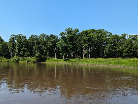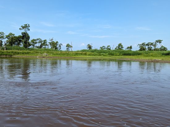 風が強い日で、あともう少し強ければ中止になるところでしたが、ギリギリのところで運良く決行されました。前日に雨が降り続いていたので、川の水は濁っていて水位も高い状態でしたが、逆に水位が高いと湿原の中の方も見渡すことができました。