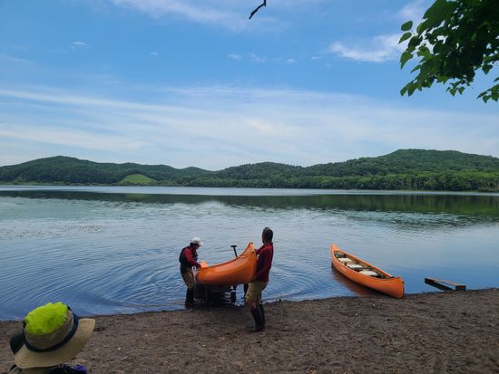集合場所でトイレを済ませカヌー乗場まで車での送迎がある。オールの持ち方や操作を学び、手荷物は丈夫そうなドライパックに入れてもらえるので心強い。装着する救命胴衣にはスマホ用のポケットがあって便利。シートにはクッションやドリンクホルダーもあって持参すれば軽食も摂れる。オレンジ色が美しい4人乗りのカナディアンカヌーは安定感があり、望遠の写真も撮りやすい。