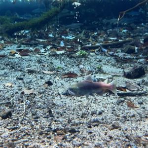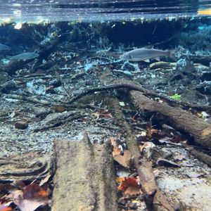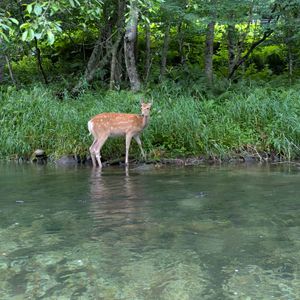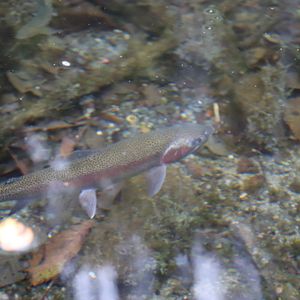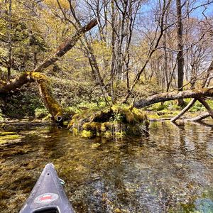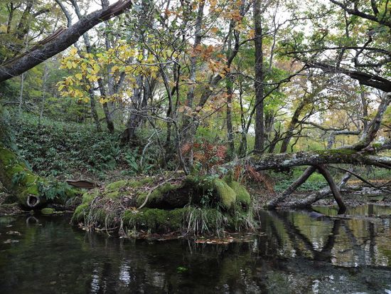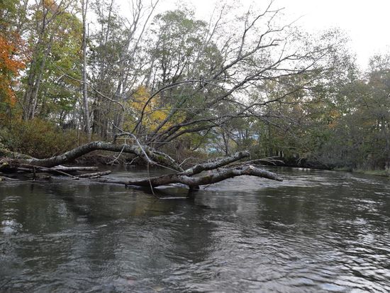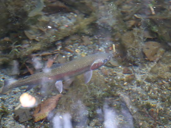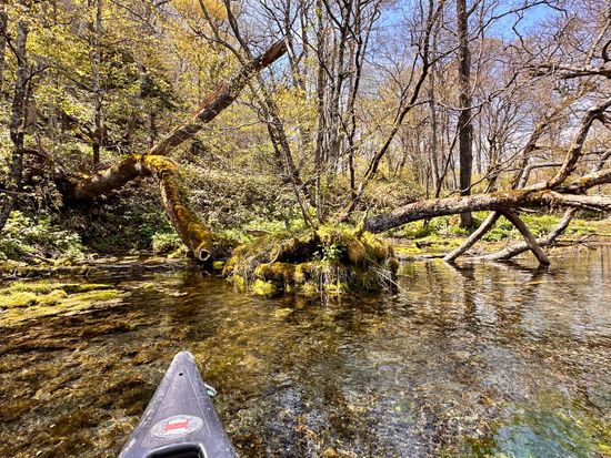 とにかく水が綺麗で、信じられない透明度。ニジマス、ヤマメ、ヒメマス、イワナ?などの川魚が船の下を泳いでいます。川藻や倒木なども本当に美しいです。
