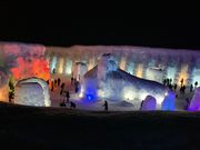 支笏湖。凍結しない湖の水で造られた柱や壁、建造物は他で見られないものです。ライトアップの時間を過ごしましたが、昼は更に支笏ブルーの氷を楽しめるのだと思います。