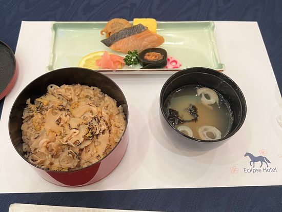 昼食は日高昆布の出汁で炊き込んだ道産米に日高産のつぶ貝をのせ、惣菜には日高産、北海道産の食材を多く使用することで地産地消を目指した「日高つぶめし定食」付!