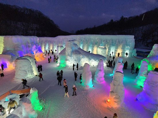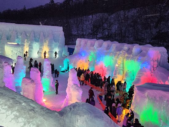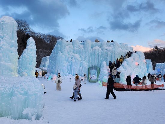 支笏湖の湖水をスプリンクラーで吹き付け凍らせた大小様々な氷のオブジェが立ち並ぶ、北海道を代表する冬の祭典です。日中は支笏湖ブルーと呼ばれるナチュラルブルーに輝き、夜は色とりどりのライトアップが幻想的な世界を演出します。
