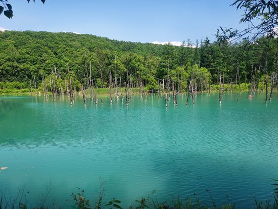 青い池は前日の雨で色がどうなるか心配でしたが綺麗なブルーでした。