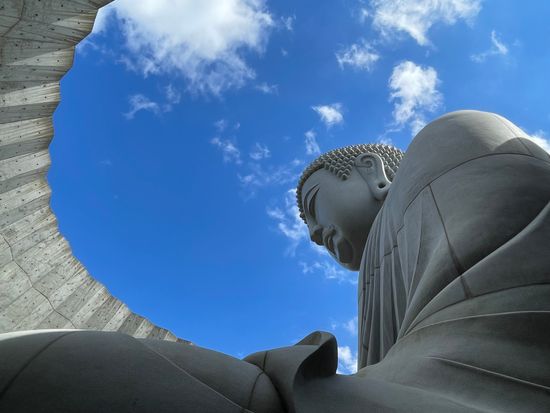 「頭大仏殿」は、世界的建築家の安藤忠雄氏によって設計されました。安藤氏のコンセプトは、大仏をラベンダーの丘で覆うこと。大仏の「頭」だけが目に入り、その斬新なデザインが特徴です。周囲の四季と調和しながら、真駒内滝野霊園の新しい象徴として、訪れる人々を魅了しています。大自然と一体となったこの景観は、見る者の心を深く引きつけることでしょう。