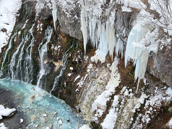 周囲の霧氷・青い美瑛川(ブルーリバー)の迫力ある美しい光景を観賞することができます。崖の隙間から流れ落ちる白い水流が、ひげのように見えることからこの名前が付けられました。