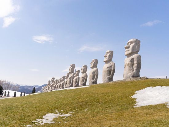 園内に立ち並ぶ巨大なモアイ像は、雪に覆われることで一層神秘的な雰囲気を放ち、まるで異世界に迷い込んだかのような体験ができます。さらに、世界的建築家・安藤忠雄が設計した頭大仏殿は必見。(別途拝観料は有料)雪景色と調和するコンクリート建築の美しさは圧巻で、静寂の中に佇む大仏の姿は、見る人に感動を与えます。