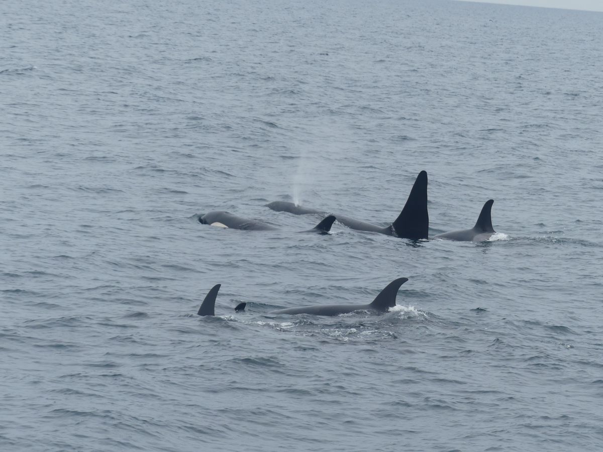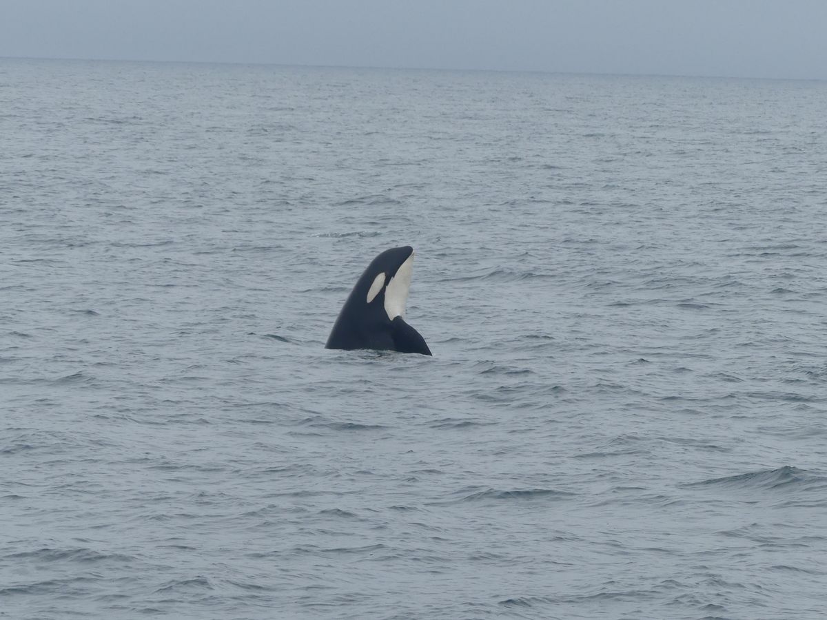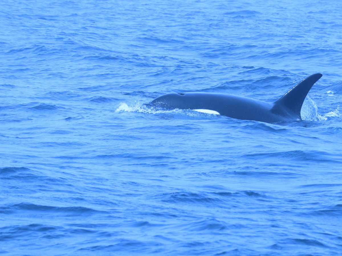 最初に2頭の大きなシャチと遭遇。その後、群れ数匹が、水面上を出たり入ったりしながら、潮を吹く。いかにも親子という雰囲気の小さな個体と、寄り添う大き目の個体。船のすぐそばを潜り込むとき、白と黒の文様が見えた。