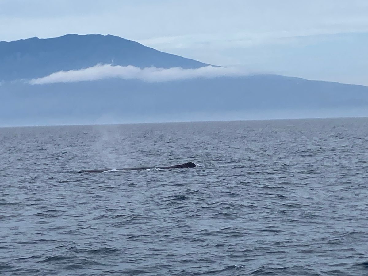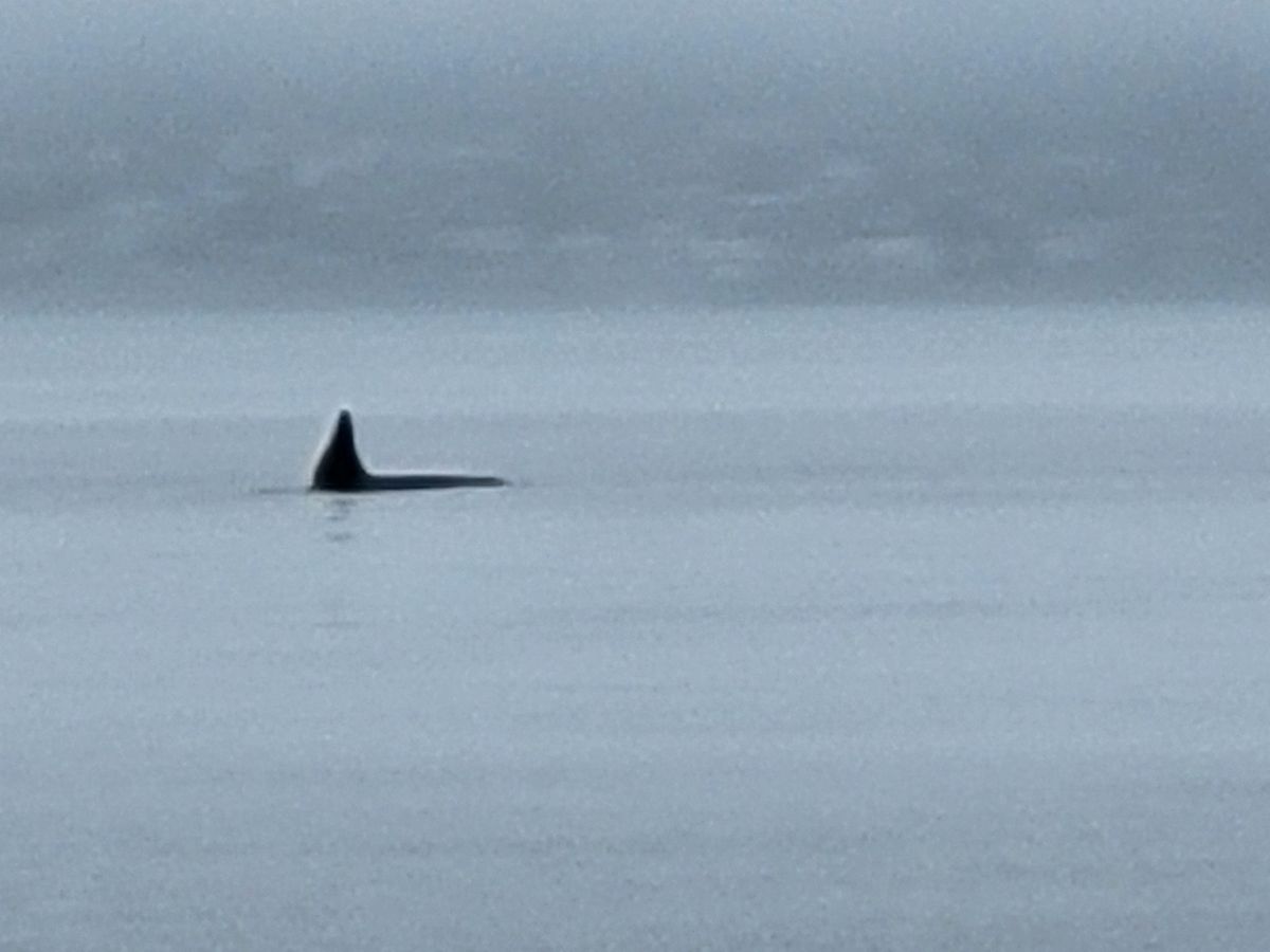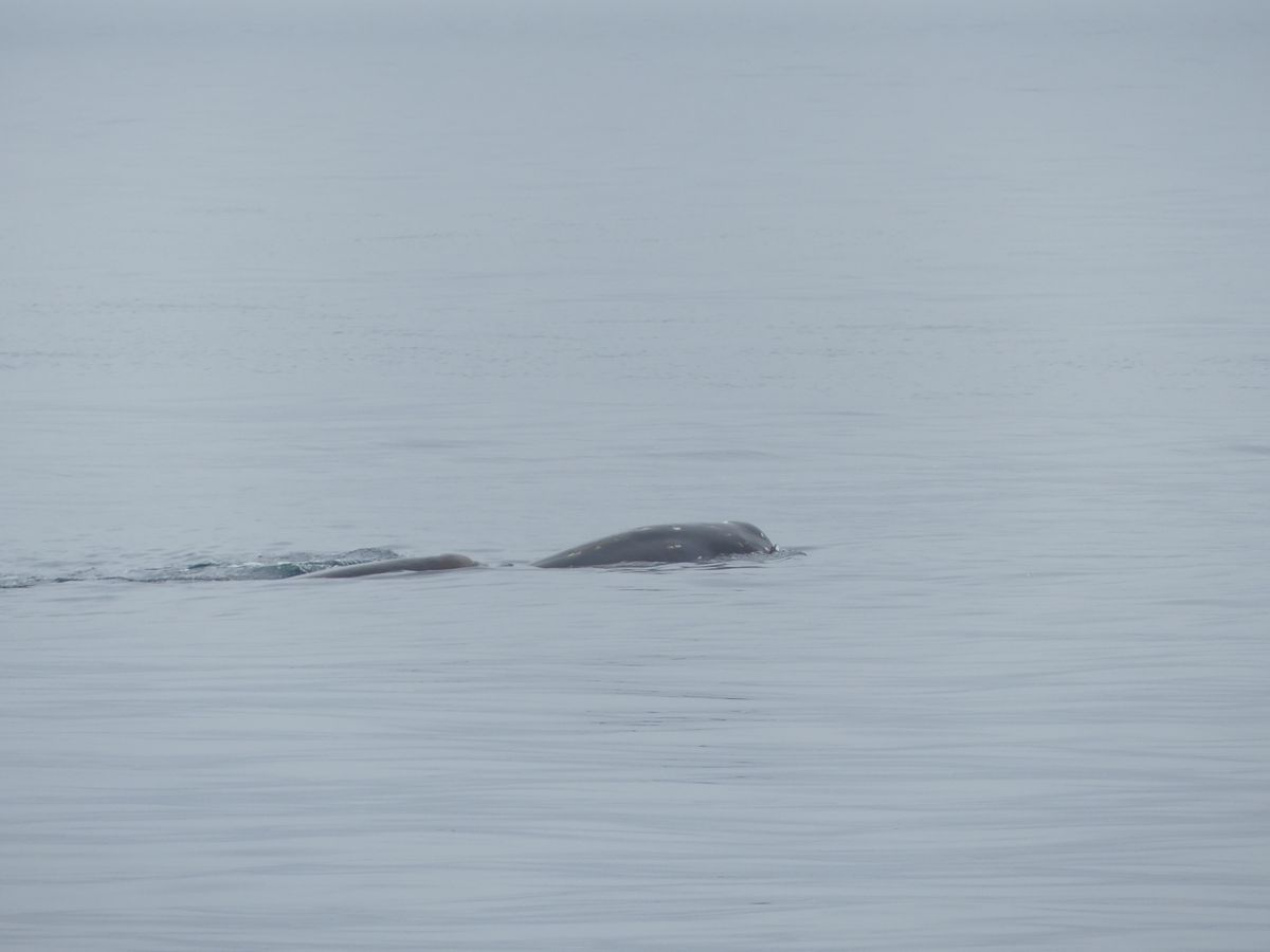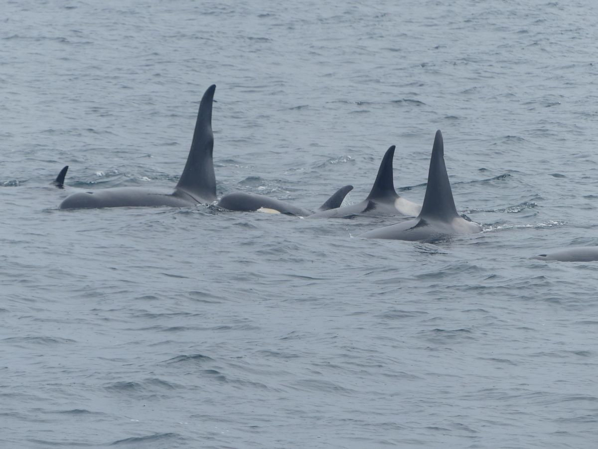 最初に2頭の大きなシャチと遭遇。その後、群れ数匹が、水面上を出たり入ったりしながら、潮を吹く。いかにも親子という雰囲気の小さな個体と、寄り添う大き目の個体。船のすぐそばを潜り込むとき、白と黒の文様が見えた。
