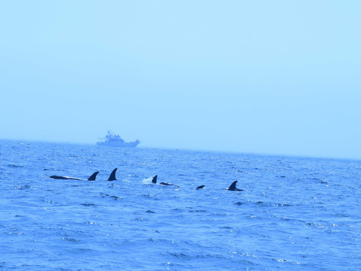最初はアカボウクジラ?が8頭くらい。双眼鏡や望遠レンズでやっとイボイボがわかる距離でしたが、こんなにたくさん居るのは初めて見ました。