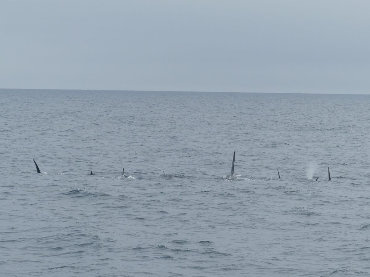 他船からの情報の場所へ向かうと、シャチ20~30頭が横一列で沖に向かっていてまるでNHKスペシャルで見た姿そのもの。