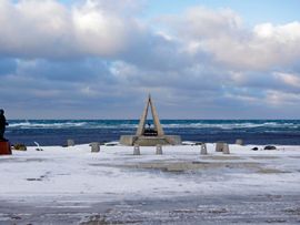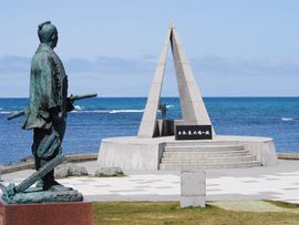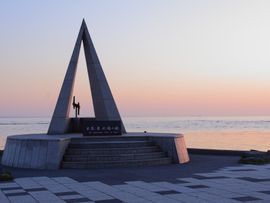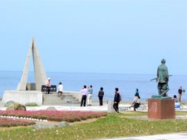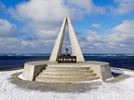 途中間宮林蔵がサハリンに渡った碑を見学して最北端を目指します。風が凄く強いです。