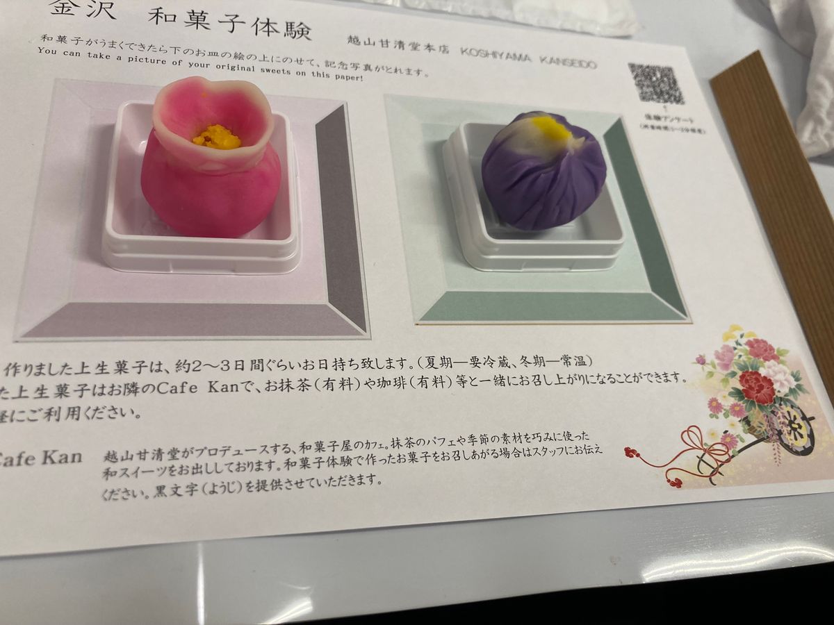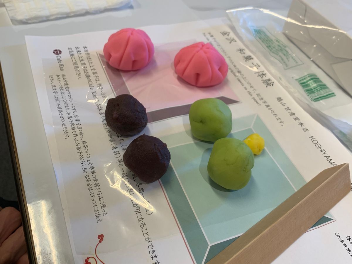 金沢の和菓子の歴史を最初に少しだけ教えてもらい、その後すぐに和菓子作りが始まりました。カップルや親子で来ている方もいらっしゃっていて、体験自体は30分程度でした。全て準備されているので和菓子の成形を目の前で教えてもらいながら楽しく作ることができました。