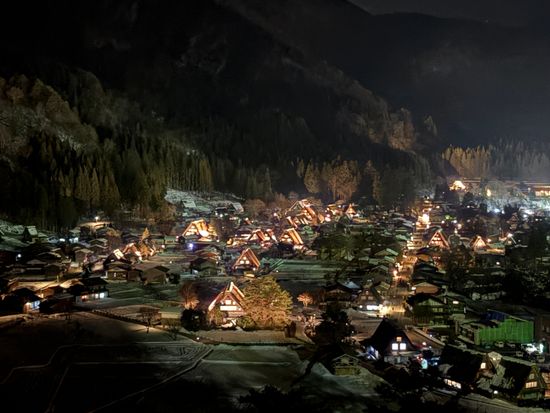 初めて白川郷を訪れました。午後は合掌造りの街並みをのびのびと散策し、夜には展望台からライトアップされた雪景色を眺めることができ、その幻想的な美しさに心を奪われました。